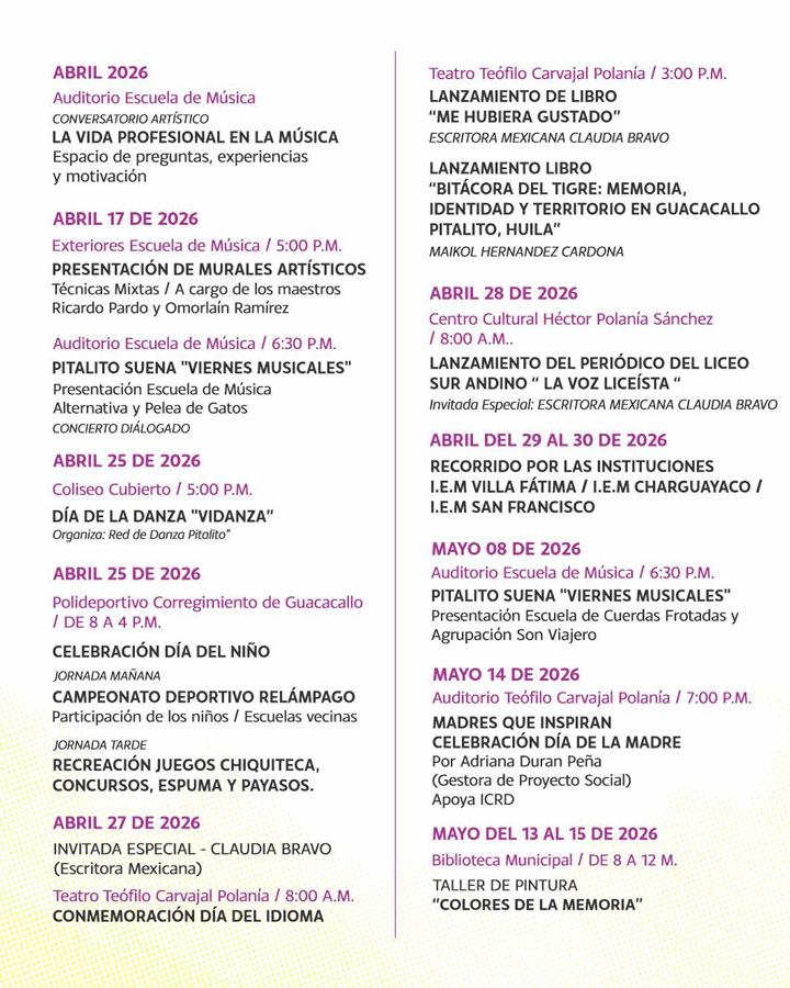 Pitalito, la capital del sur del Huila, reafirma su compromiso con el arte y la tradición. En Noticias Enredijo hemos analizado la programación oficial de la Secretaría de Cultura para brindarle una guía detallada de los eventos que marcarán el pulso de la ciudad entre abril y julio de 2026.